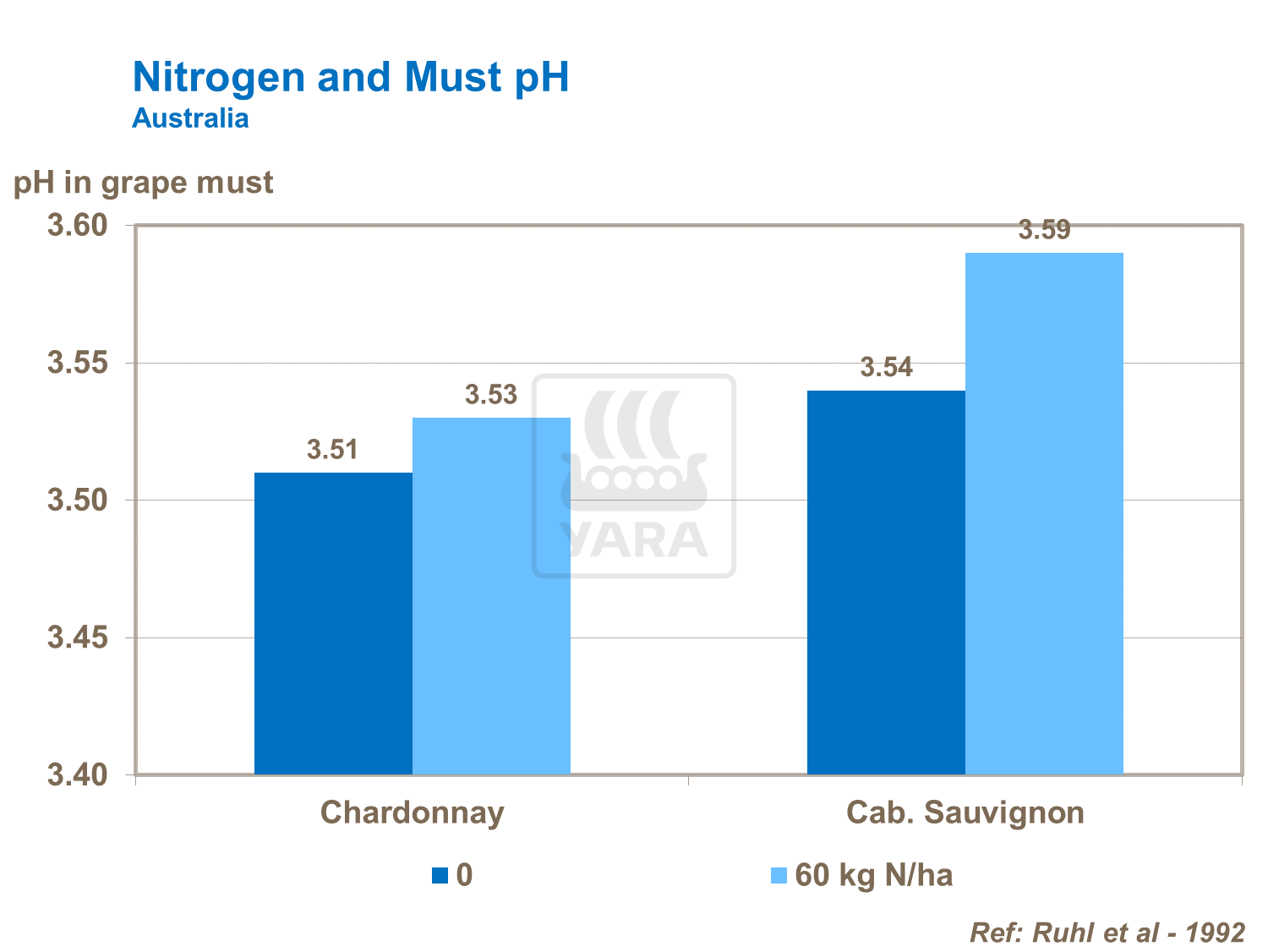 High nitrogen increases the pH of the must and wine, increasing the malate concentration in grape juice. Too much available nitrogen on the other hand can create strong canopy growth, increasing shading and wine pH.