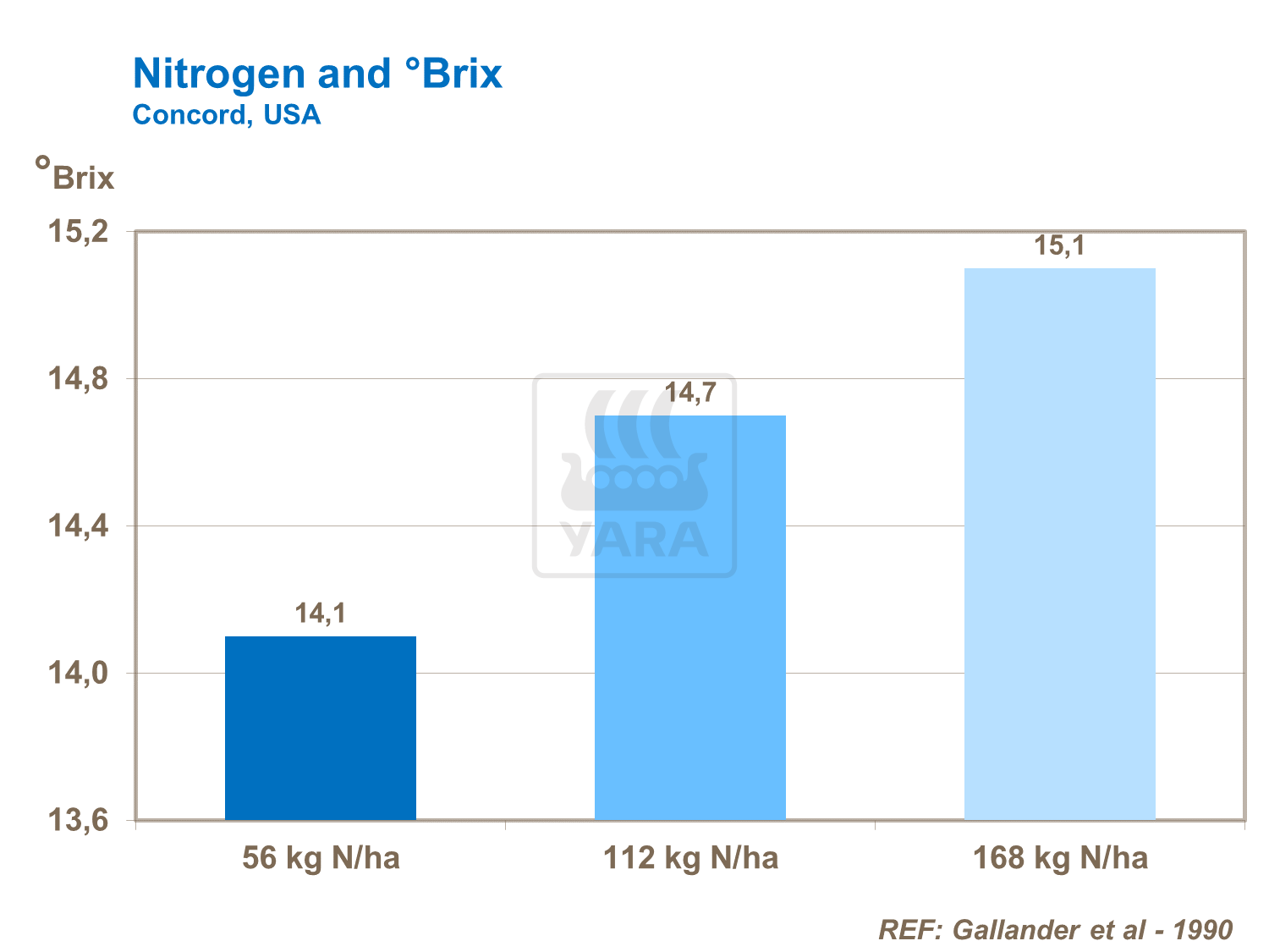 Considering nutritional aspects, the higher the availability of nitrogen, the higher the sugar content of the grape and the potential alcohol yield after fermentation, as well as the residual sugars in the wine, as measured by °Brix. Up to certain levels, nitrogen-use increases Total Soluble Solids.