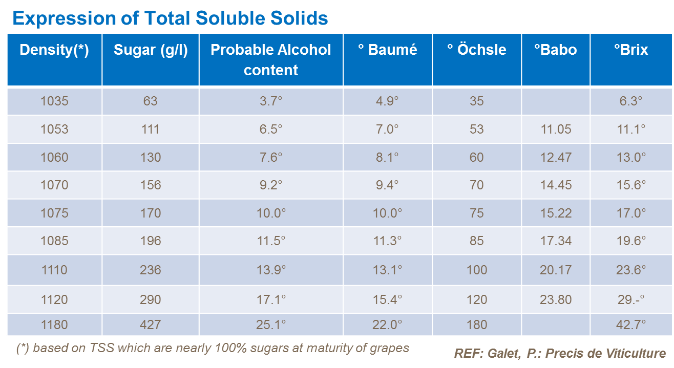Sugar content is measured and expressed as °Brix – or °Baumé, °Öchsle, °Babo. The °Brix value varies according to the type of grape and levels are set for the style of the wine produced by each winery.