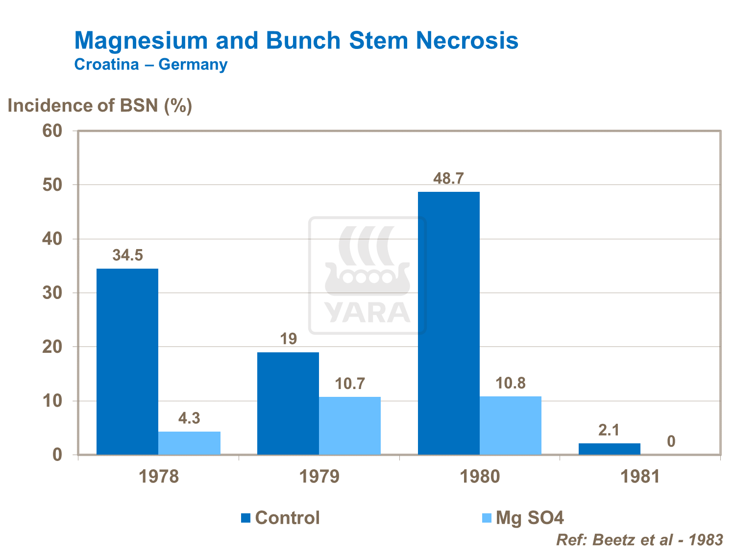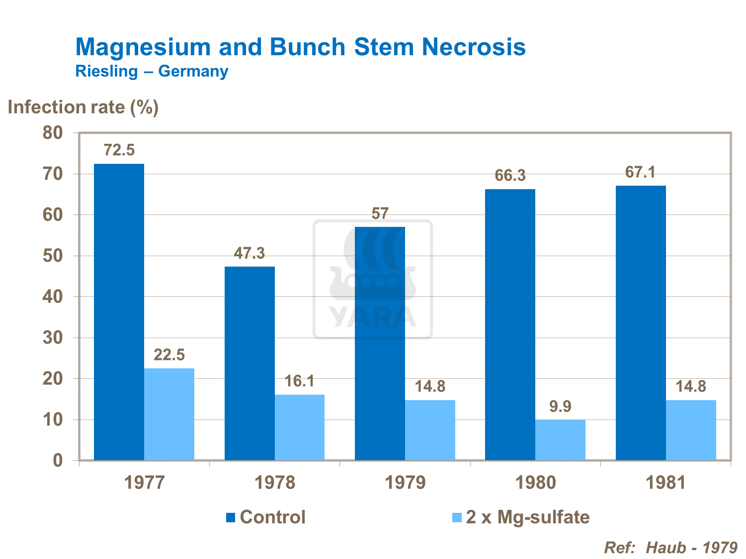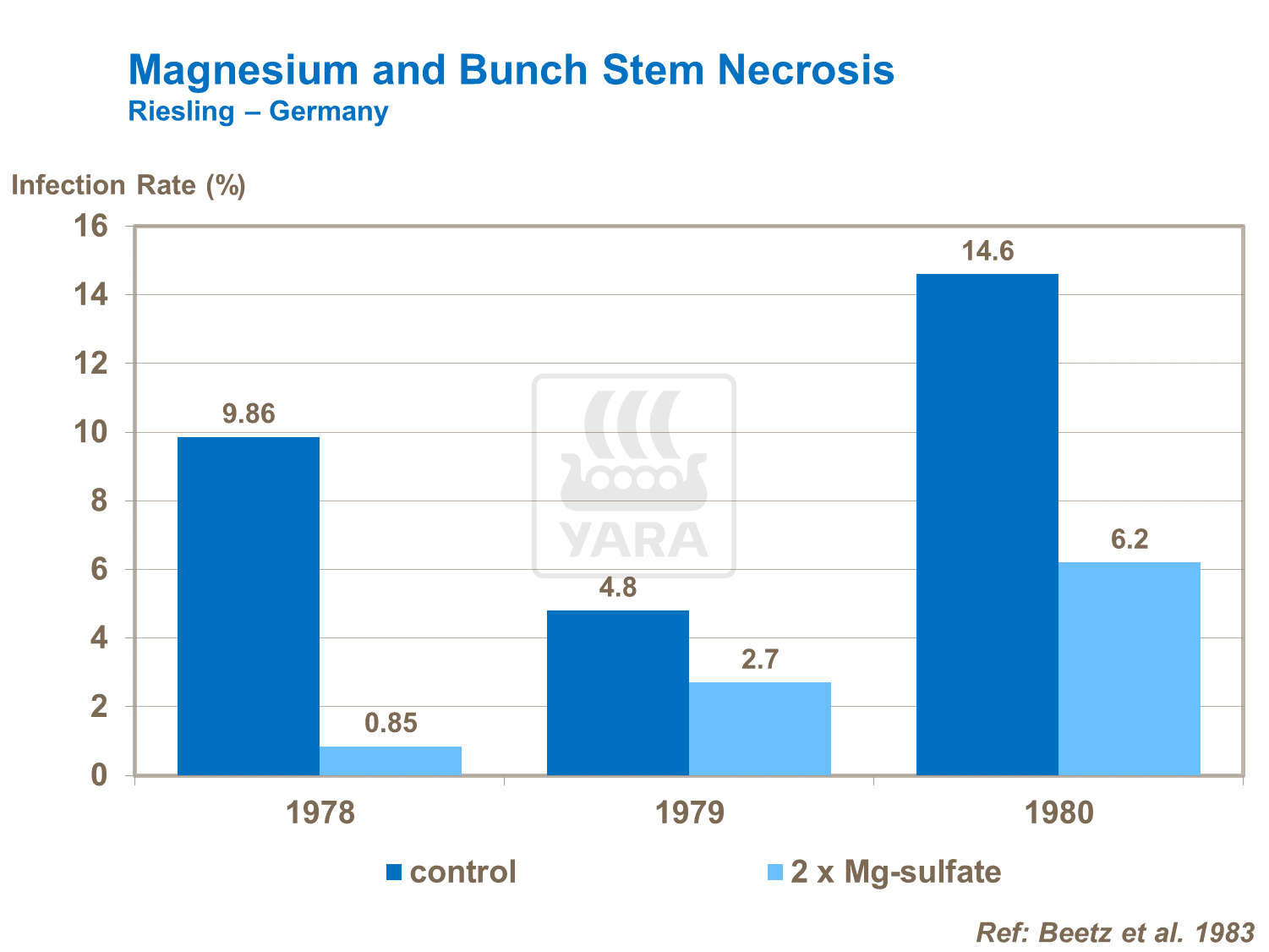 Bunch stem necrosis is often associated with a magnesium deficiency and the imbalance of magnesium and nitrogen. Research suggests that low levels of sugars in storage organs and fruit lead to nitrate accumulation, particularly during cold weather during maturation. Two to three foliar applications of magnesium starting just before veraison minimise the problem.